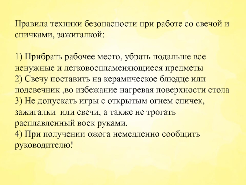 3) Не допускать игры с открытым огнем спичек, зажигалки или свечи, а также не трогать расплавленный воск руками.