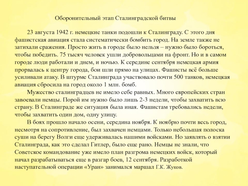 В боях прошло начало осени, середина ноября. К ноябрю почти весь город, несмотря на сопротивление, был захвачен немцами. Только небольшая полоска суши на берегу Волги еще удерживалась нашими войсками. Но заявлять о взятии Сталинграда, как это сделал Гитлер, было еще рано. Немцы не знали, что Советское командование уже имело план разгрома немецких войск, который начал разрабатываться еще в разгар боев, 12 сентября. Разработкой наступательной операции «Уран» занимался маршал Г.К. Жуков.