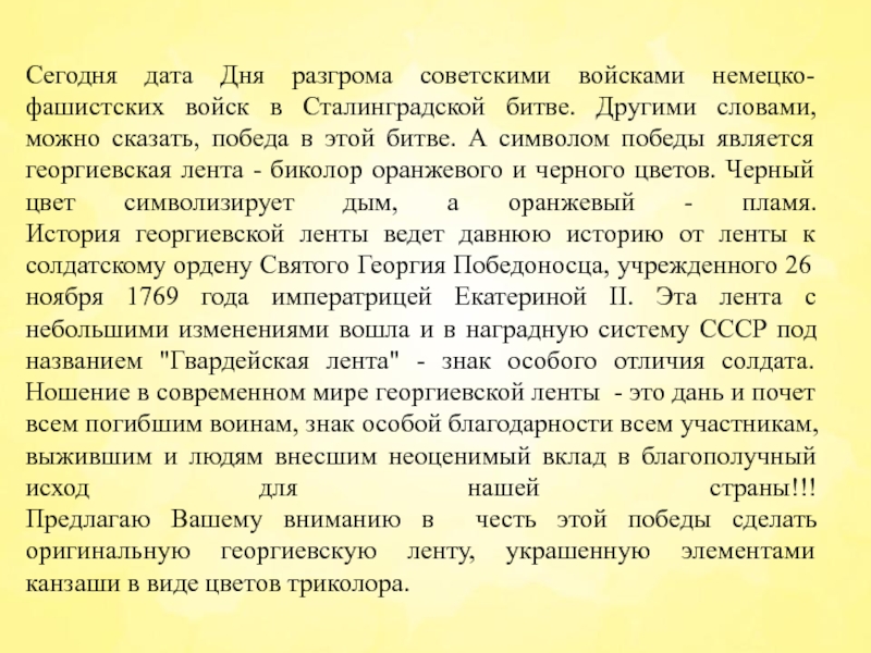 Слайд 2Цель: изготовление оригинальной георгиевской ленты ко дню Победы в Сталинградской битве