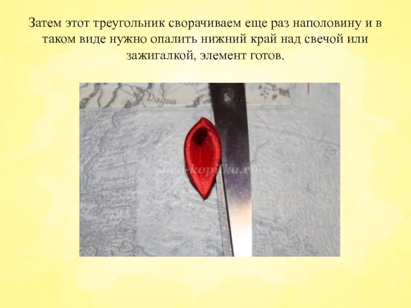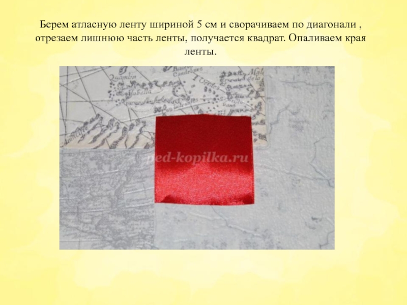 Слайд 14Берем атласную ленту шириной 5 см и сворачиваем по диагонали ,