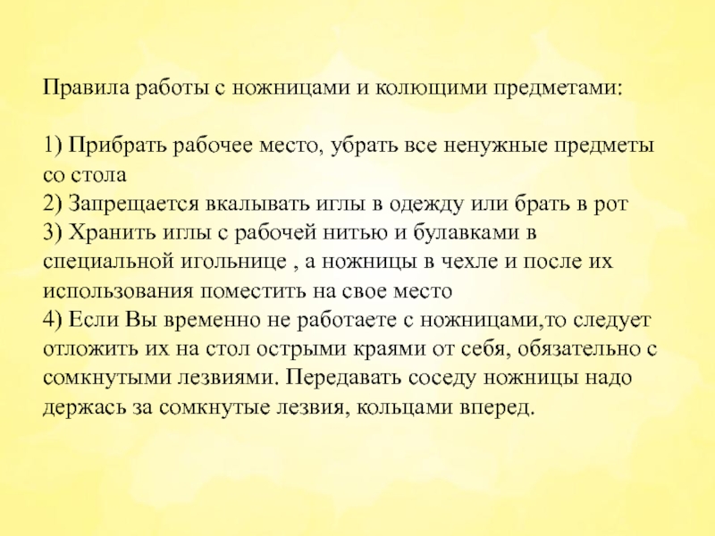 3) Хранить иглы с рабочей нитью и булавками в специальной игольнице , а ножницы в чехле и после их использования поместить на свое место