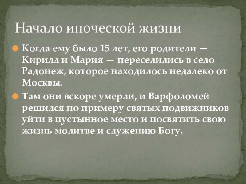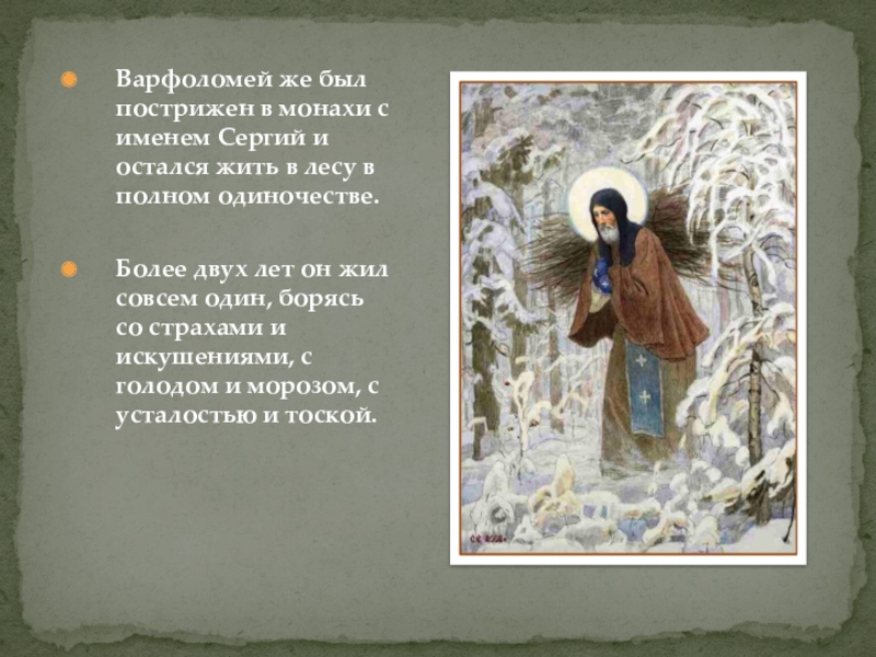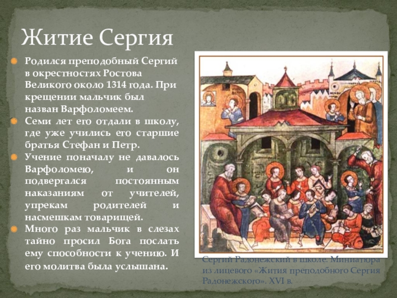 Учение поначалу не давалось Варфоломею, и он подвергался постоянным наказаниям от учителей, упрекам родителей и насмешкам товарищей.