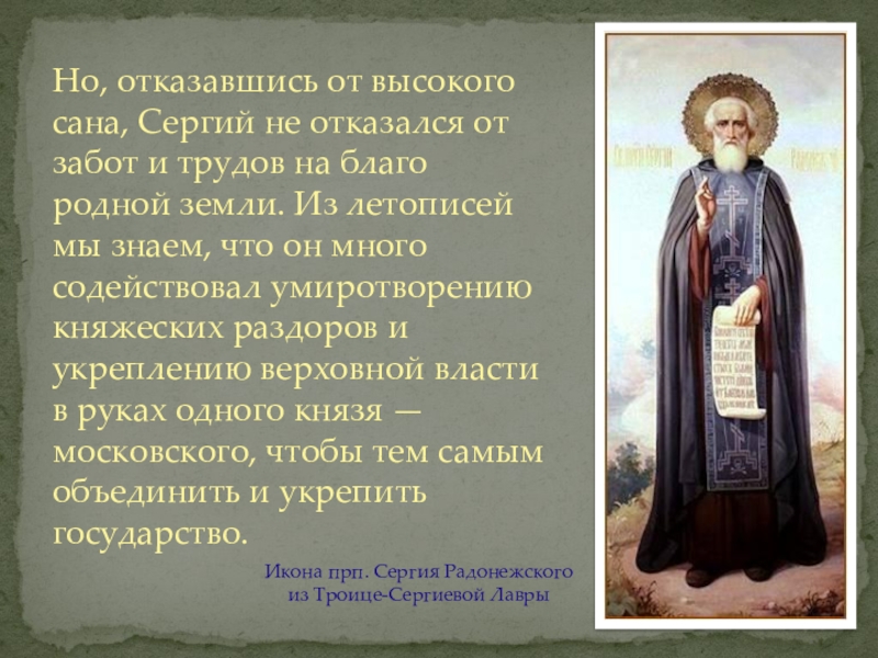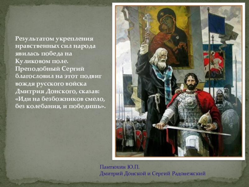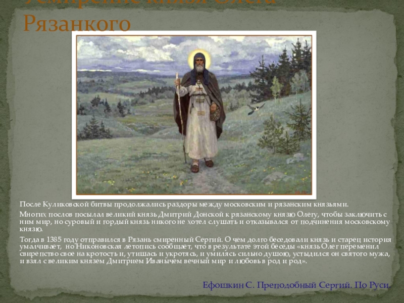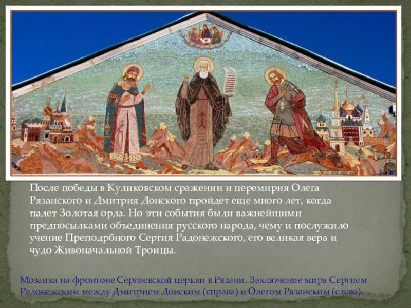 После победы в Куликовском сражении и перемирия Олега Рязанского и Дмитрия Донского пройдет еще много лет, когда падет Золотая орда. Но эти события были важнейшими предпосылками объединения русского народа, чему и послужило учение Преподрбного Сергия Радонежского, его великая вера и чудо Живоначальной Троицы.