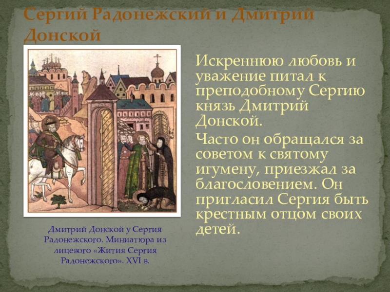 Дмитрий Донской у Сергия Радонежского. Миниатюра из лицевого «Жития Сергия Радонежского». XVI в.