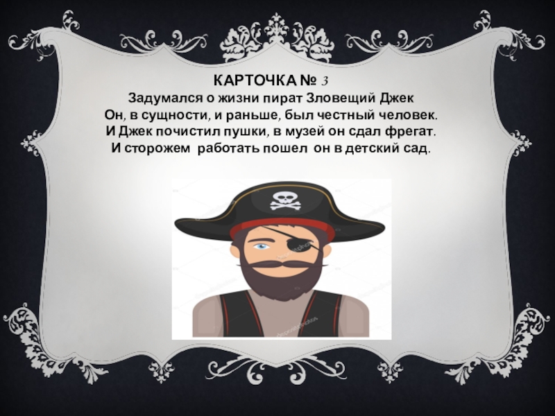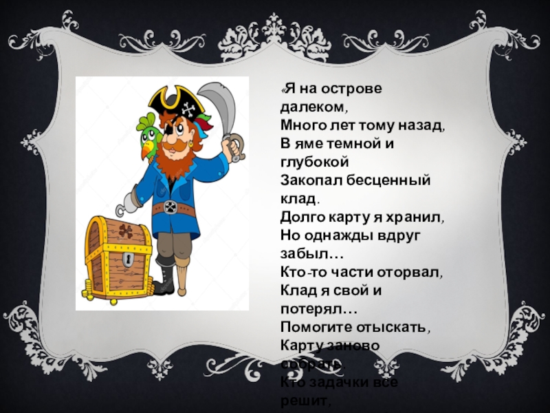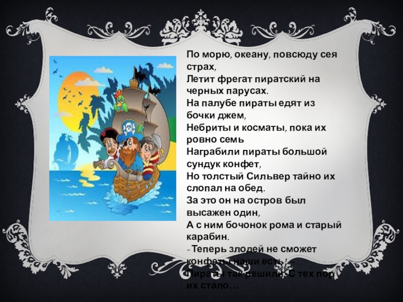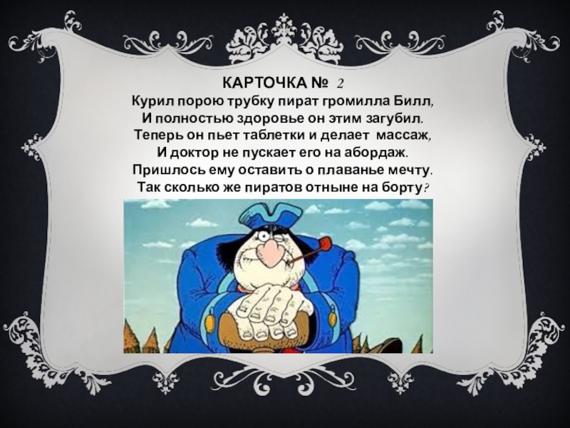Сильвера, сколько их осталось? В море они подобрали двух пиратов с тонущего корабля. Сколько их стало? Доплыв до берега, пираты с тонущего корабля отправились к себе домой, вместе с ними ушел пират Джон. Сколько пиратов осталось на корабле? Чтобы пополнить свою команду, капитан набрал столько же пиратов, сколько осталось на корабле. Сколько их теперь стало? (необходимо составить примеры)
