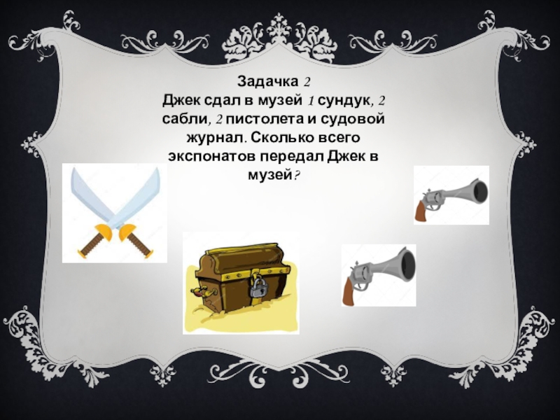Джек сдал в музей 1 сундук, 2 сабли, 2 пистолета