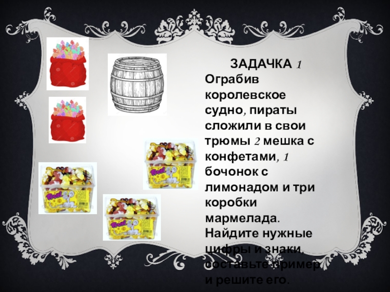 с конфетами, 1 бочонок с лимонадом и три коробки мармелада. Найдите нужные цифры и знаки, составьте пример и решите его.