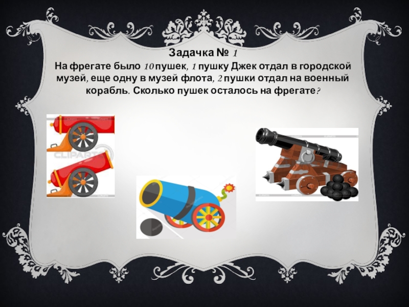 в городской музей, еще одну в музей флота, 2 пушки отдал на военный корабль. Сколько пушек осталось на фрегате?