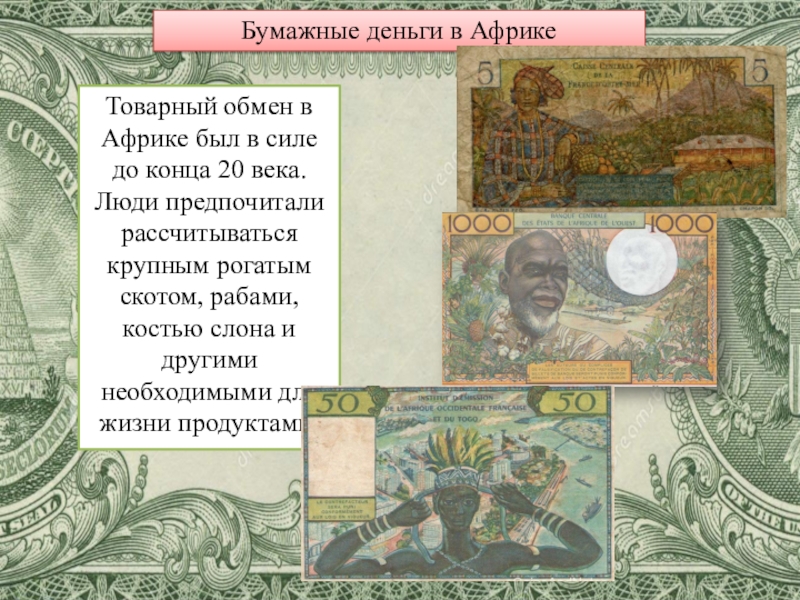 конца 20 века. Люди предпочитали рассчитываться крупным рогатым скотом, рабами, костью слона и другими необходимыми для жизни продуктами.