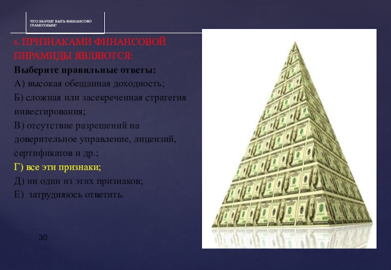 Слайд 306. ПРИЗНАКАМИ ФИНАНСОВОЙ ПИРАМИДЫ ЯВЛЯЮТСЯ: