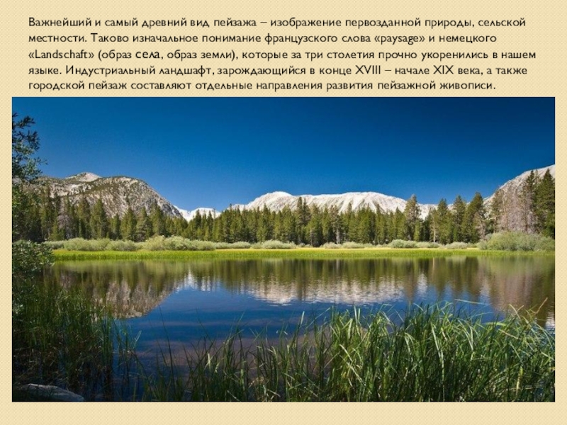 Слайд 3Важнейший и самый древний вид пейзажа – изображение первозданной природы, сельской