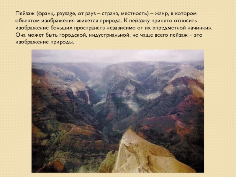 Слайд 2Пейзаж (франц. paysage, от pays – страна, местность) – жанр, в