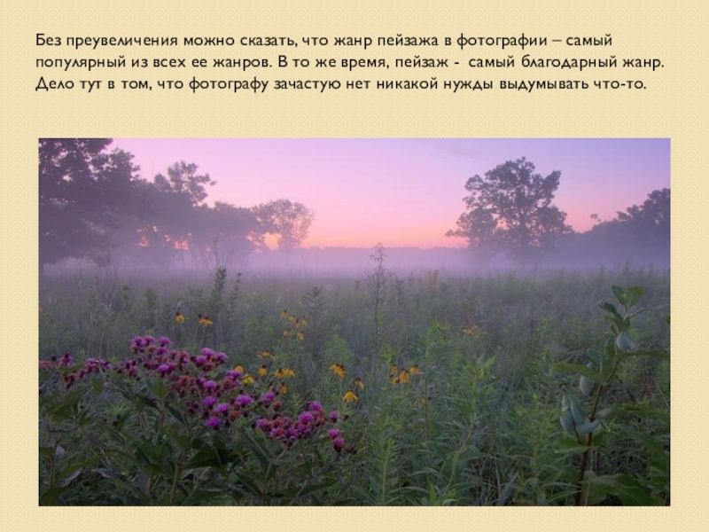 Слайд 4Без преувеличения можно сказать, что жанр пейзажа в фотографии – самый