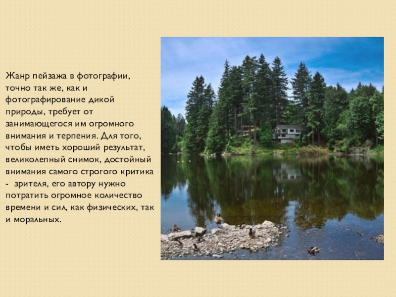 Слайд 6Жанр пейзажа в фотографии, точно так же, как и фотографирование дикой