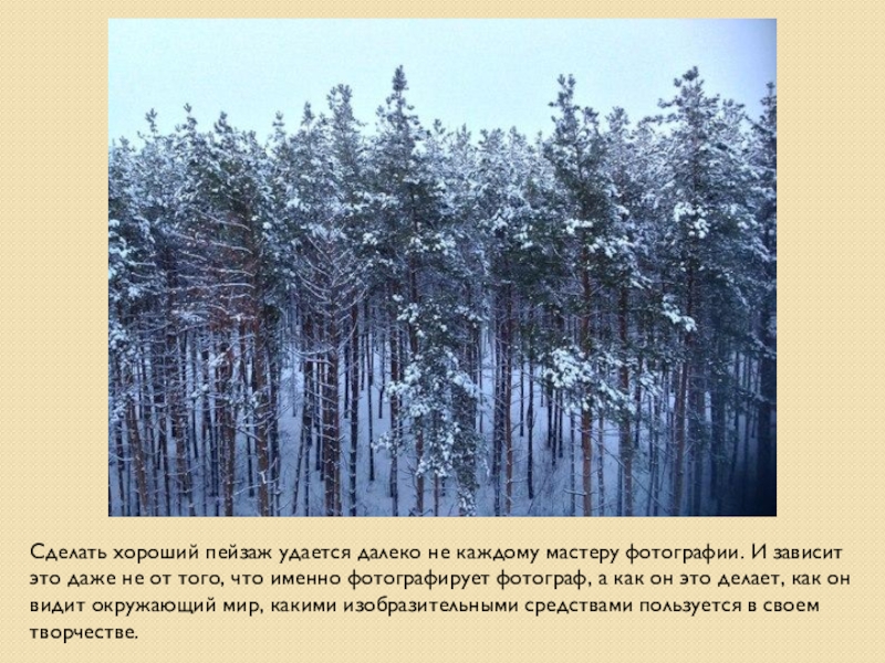 Слайд 11Сделать хороший пейзаж удается далеко не каждому мастеру фотографии. И зависит