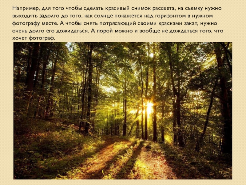Слайд 7Например, для того чтобы сделать красивый снимок рассвета, на съемку нужно