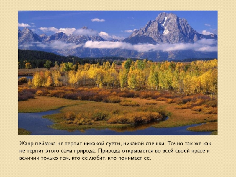 Слайд 8Жанр пейзажа не терпит никакой суеты, никакой спешки. Точно так же