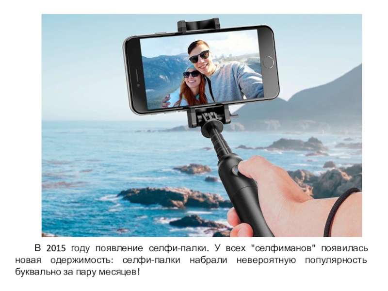 Слайд 11 В 2015 году появление селфи-палки. У всех "селфиманов" появилась новая одержимость: