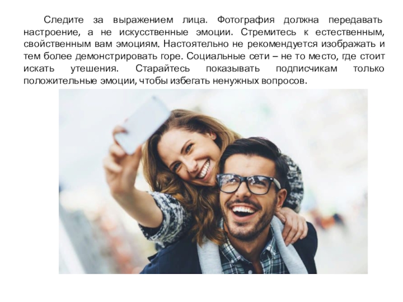эмоции. Стремитесь к естественным, свойственным вам эмоциям. Настоятельно не рекомендуется изображать и тем более демонстрировать горе. Социальные сети – не то место, где стоит искать утешения. Старайтесь показывать подписчикам только положительные эмоции, чтобы избегать ненужных вопросов.