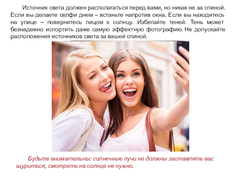 Если вы делаете селфи днем – встаньте напротив окна. Если вы находитесь на улице – повернитесь лицом к солнцу. Избегайте теней. Тень может безнадежно испортить даже самую эффектную фотографию. Не допускайте расположения источников света за вашей спиной.