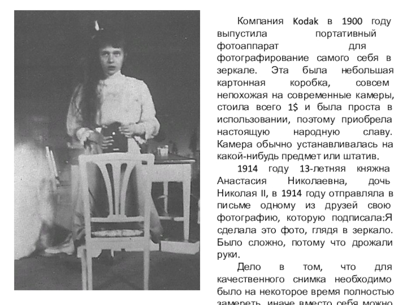 Слайд 4 Компания Kodak в 1900 году выпустила портативный фотоаппарат для фотографирование самого