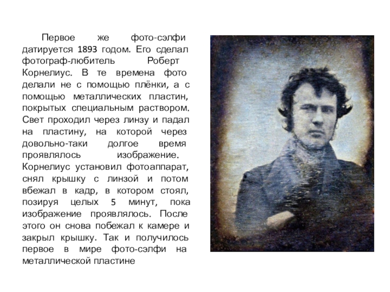 Слайд 3 Первое же фото-сэлфи датируется 1893 годом. Его сделал фотограф-любитель Роберт Корнелиус.