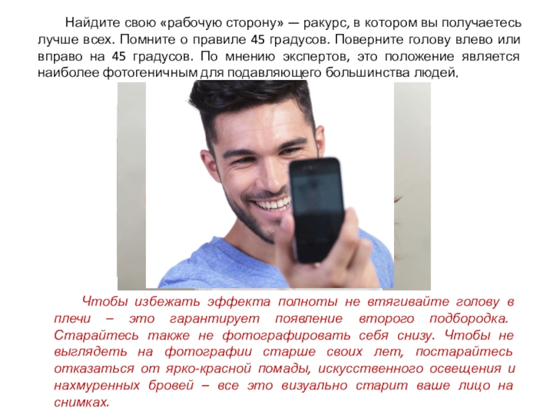 Слайд 14 Найдите свою «рабочую сторону» — ракурс, в котором вы получаетесь лучше