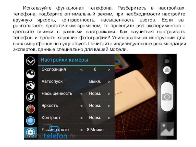 Слайд 16 Используйте функционал телефона. Разберитесь в настройках телефона, подберите оптимальный режим, при