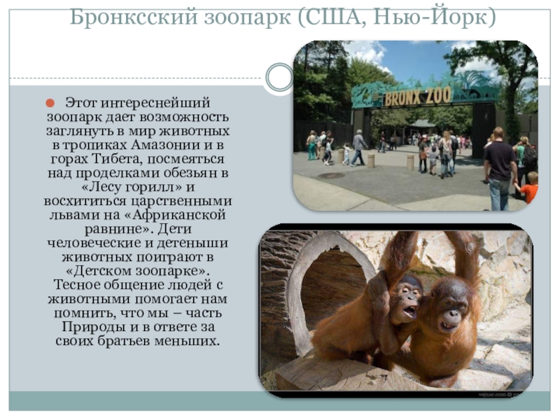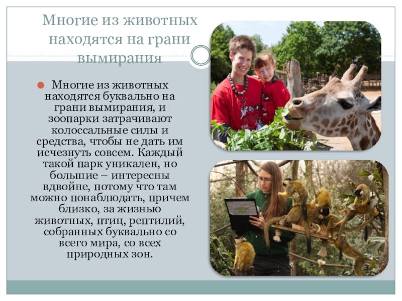 на грани вымирания, и зоопарки затрачивают колоссальные силы и средства, чтобы не дать им исчезнуть совсем. Каждый такой парк уникален, но большие – интересны вдвойне, потому что там можно понаблюдать, причем близко, за жизнью животных, птиц, рептилий, собранных буквально со всего мира, со всех природных зон.
