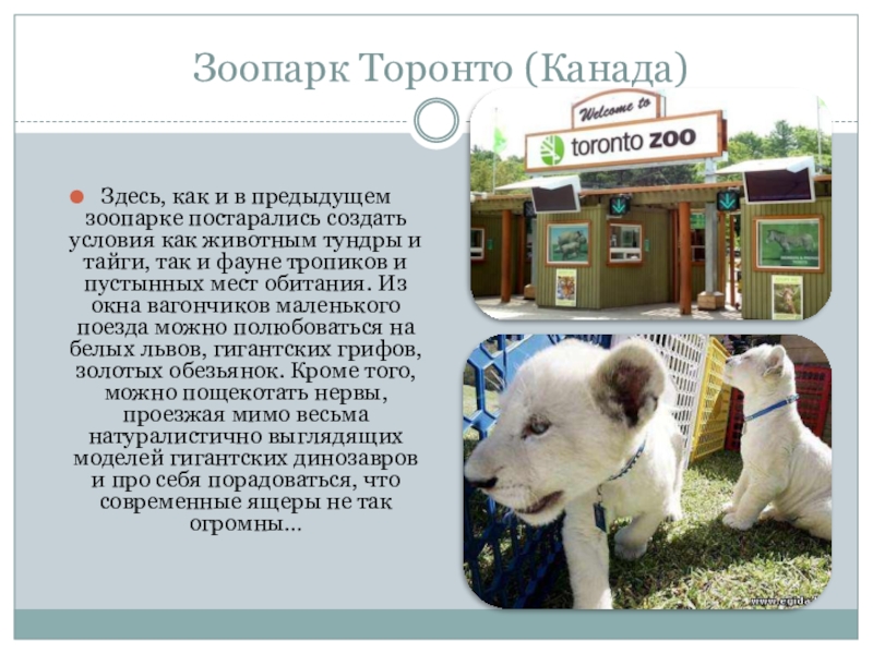 условия как животным тундры и тайги, так и фауне тропиков и пустынных мест обитания. Из окна вагончиков маленького поезда можно полюбоваться на белых львов, гигантских грифов, золотых обезьянок. Кроме того, можно пощекотать нервы, проезжая мимо весьма натуралистично выглядящих моделей гигантских динозавров и про себя порадоваться, что современные ящеры не так огромны…