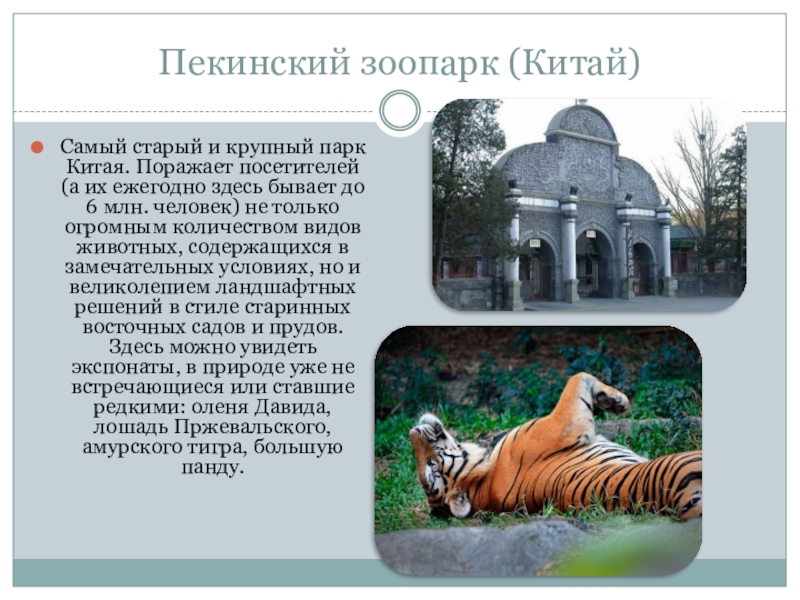 их ежегодно здесь бывает до 6 млн. человек) не только огромным количеством видов животных, содержащихся в замечательных условиях, но и великолепием ландшафтных решений в стиле старинных восточных садов и прудов. Здесь можно увидеть экспонаты, в природе уже не встречающиеся или ставшие редкими: оленя Давида, лошадь Пржевальского, амурского тигра, большую панду.
