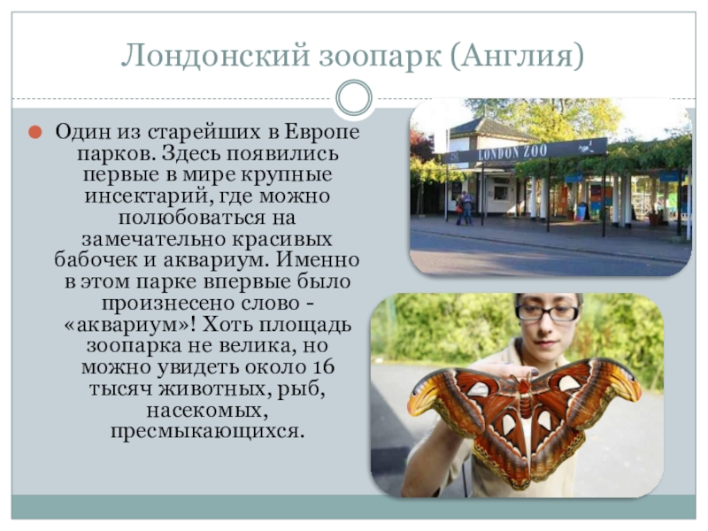 в мире крупные инсектарий, где можно полюбоваться на замечательно красивых бабочек и аквариум. Именно в этом парке впервые было произнесено слово - «аквариум»! Хоть площадь зоопарка не велика, но можно увидеть около 16 тысяч животных, рыб, насекомых, пресмыкающихся.