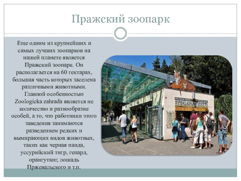 планете является Пражский зоопарк. Он располагается на 60 гектарах, большая часть которых заселена различными животными. Главной особенностью Zoologicka zahrada является не количество и разнообразие особей, а то, что работники этого заведения занимаются разведением редких и вымирающих видов животных, таких как черная панда, уссурийский тигр, гепард, орангутанг, лошадь Пржевальского и т.п.