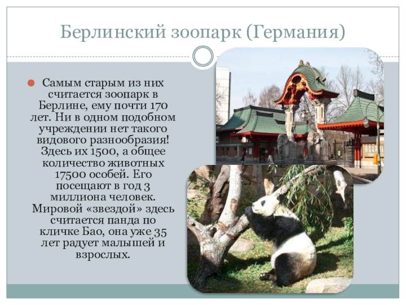 почти 170 лет. Ни в одном подобном учреждении нет такого видового разнообразия! Здесь их 1500, а общее количество животных 17500 особей. Его посещают в год 3 миллиона человек. Мировой «звездой» здесь считается панда по кличке Бао, она уже 35 лет радует малышей и взрослых.