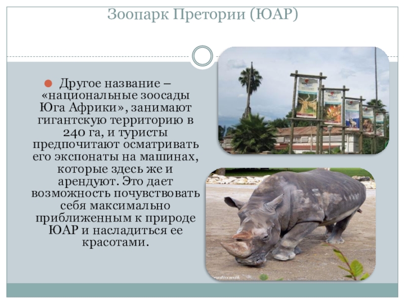 гигантскую территорию в 240 га, и туристы предпочитают осматривать его экспонаты на машинах, которые здесь же и арендуют. Это дает возможность почувствовать себя максимально приближенным к природе ЮАР и насладиться ее красотами.