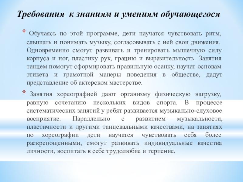 Занятия хореографией дают организму физическую нагрузку, равную сочетанию нескольких видов спорта. В процессе систематических занятий у ребят развивается музыкально-слуховое восприятие. Параллельно с развитием музыкальности, пластичности и другими танцевальными качествами, на занятиях по хореографии дети научатся чувствовать себя более раскрепощенными, смогут развивать индивидуальные качества личности, воспитать в себе трудолюбие и терпение.
