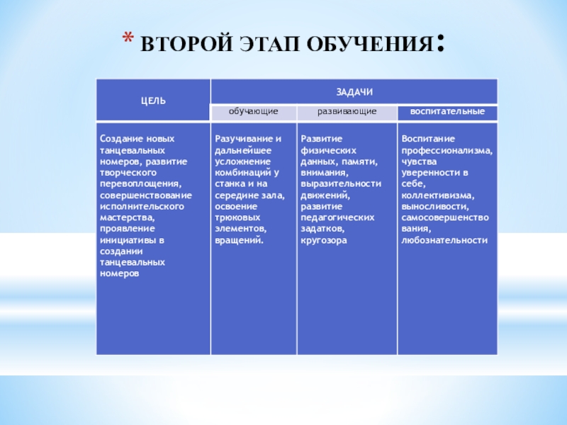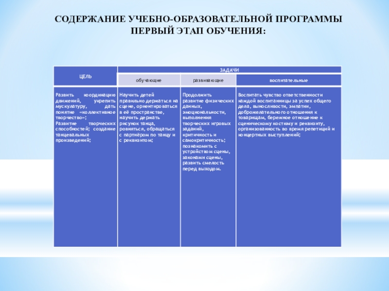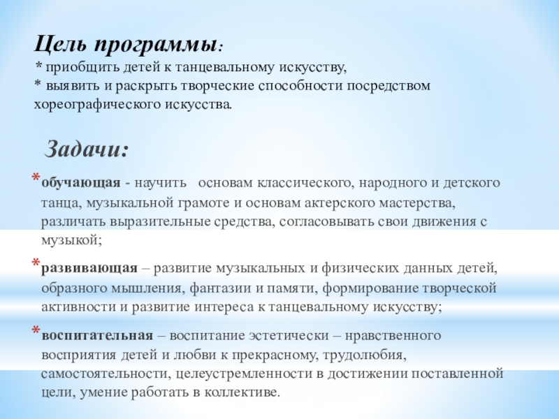 обучающая - научить основам классического, народного и детского танца, музыкальной грамоте и основам актерского мастерства, различать выразительные средства, согласовывать свои движения с музыкой;