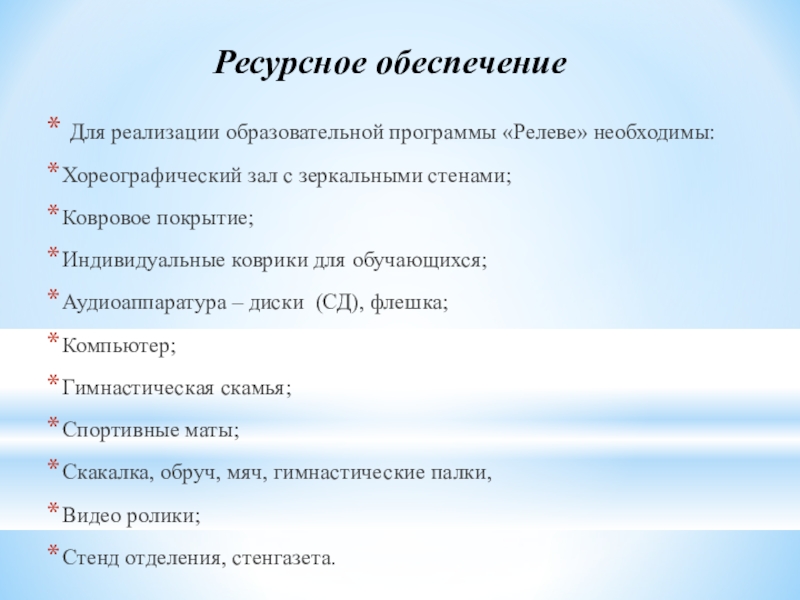 Для реализации образовательной программы «Релеве» необходимы: