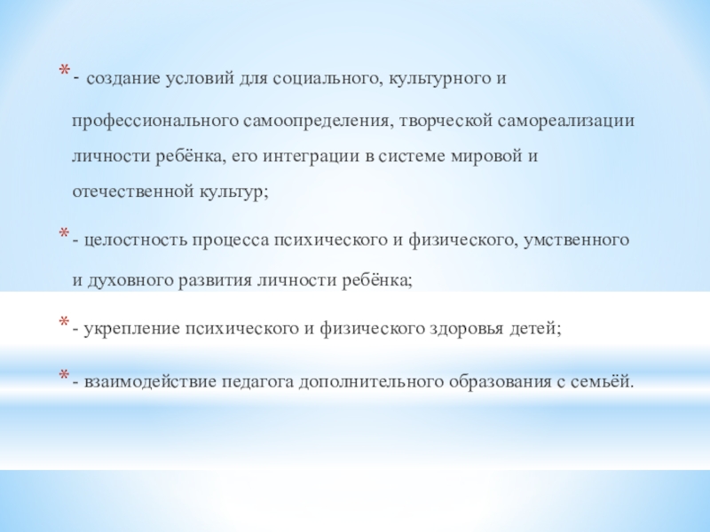 Слайд 6- создание условий для coциального, культурного и профессионального самоопределения, творческой самореализации