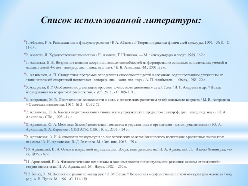 10. Аршавский, И. А. Основы возрастной периодизации. Возрастная физиология / И. А. Аршавский. Л. : Изд-во Ленинград, ун-та, 1975. - 67 с.