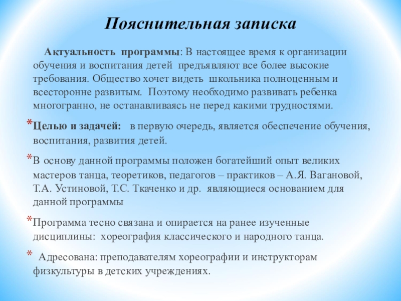 В основу данной программы положен богатейший опыт великих мастеров танца, теоретиков, педагогов – практиков – А.Я. Вагановой, Т.А. Устиновой, Т.С. Ткаченко и др. являющиеся основанием для данной программы