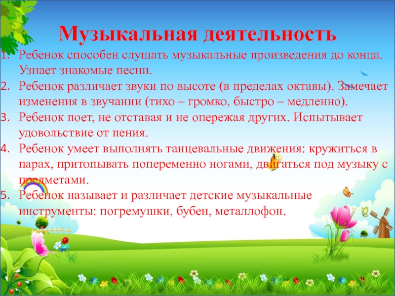Ребенок различает звуки по высоте (в пределах октавы). Замечает изменения в звучании (тихо – громко, быстро – медленно).