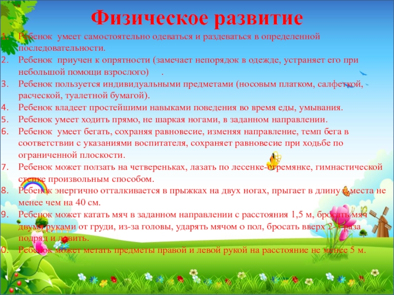 Ребенок умеет бегать, сохраняя равновесие, изменяя направление, темп бега в соответствии с указаниями воспитателя, сохраняет равновесие при ходьбе по ограниченной плоскости.