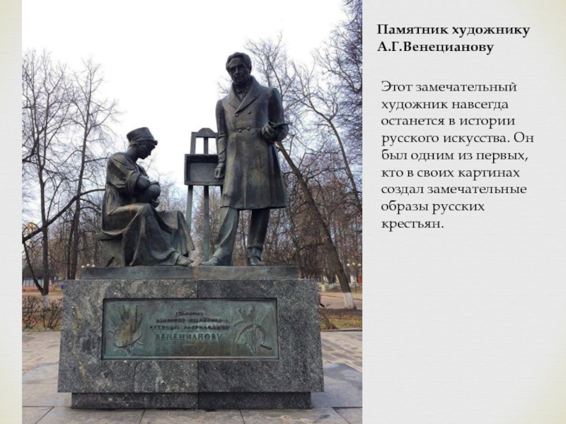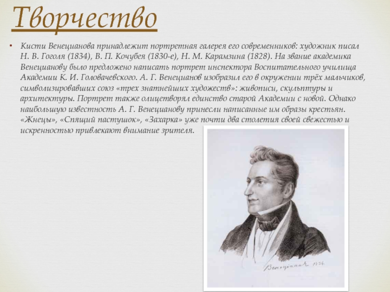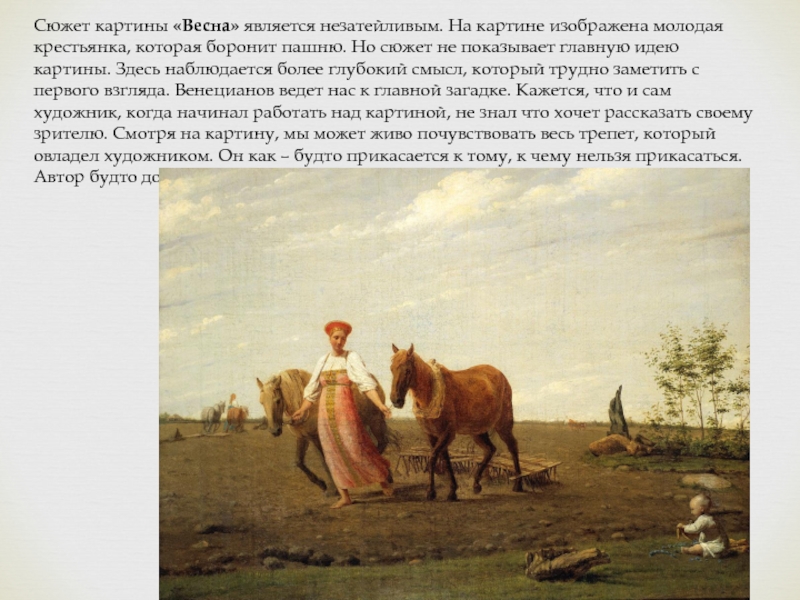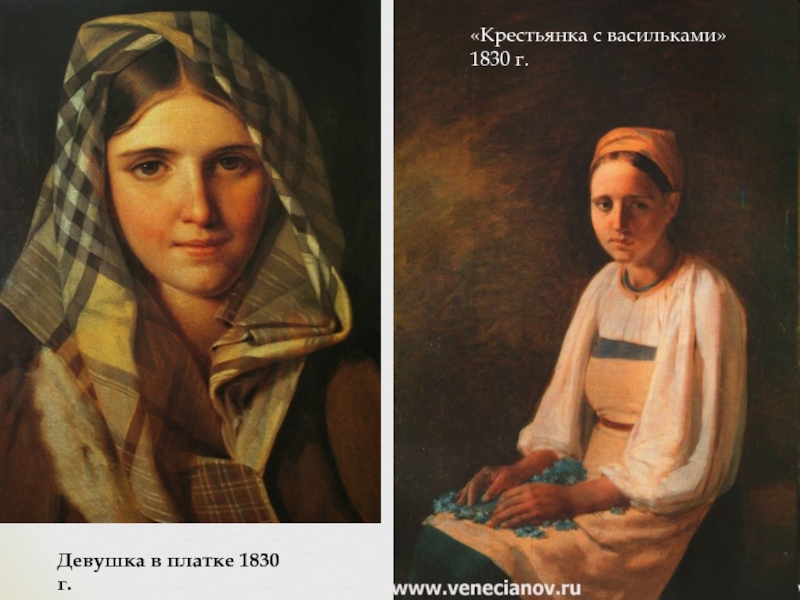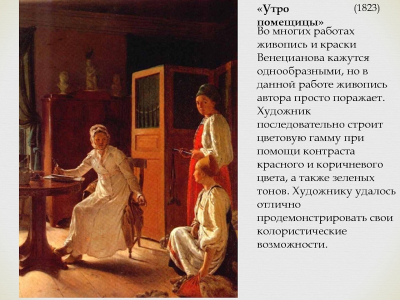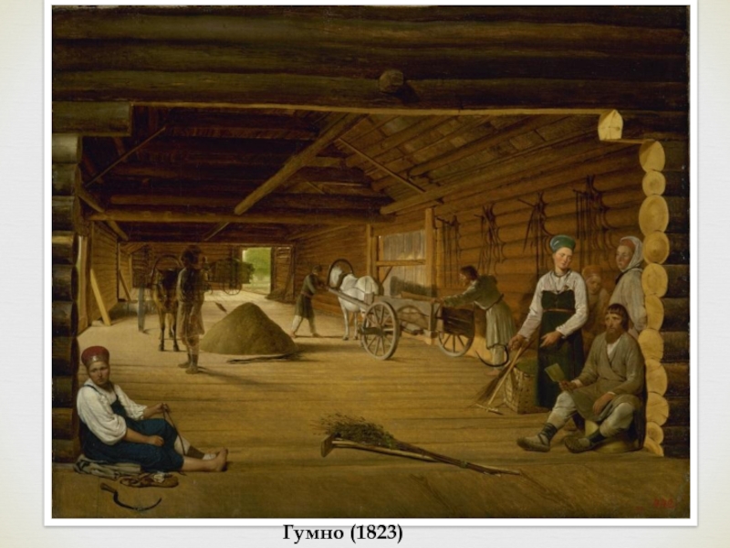 Уже в этапной картине Гумно (1821-1823, Русский музей) сельский быт выглядит как непреложная основа художественного изучения натуры. Лучшие из картин Венецианова передают состояние идеализированной, просветленной гармонии; с другой стороны, в них очевидно берет верх романтическое начало, обаяние не идеалов, а простых естественных чувств на фоне родной природы и быта.