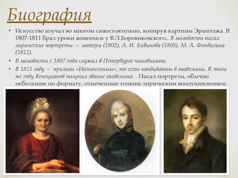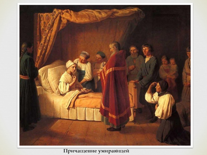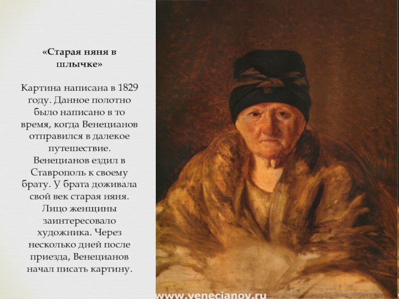 В 1830 - 1840-е годы в творческой жизни Венецианова появляются новые тенденции. В картинах "Причащение умирающей", "Старуха с клюкой", "Основание Петербурга" заметны сухость и жесткость линий, блеклость колорита.