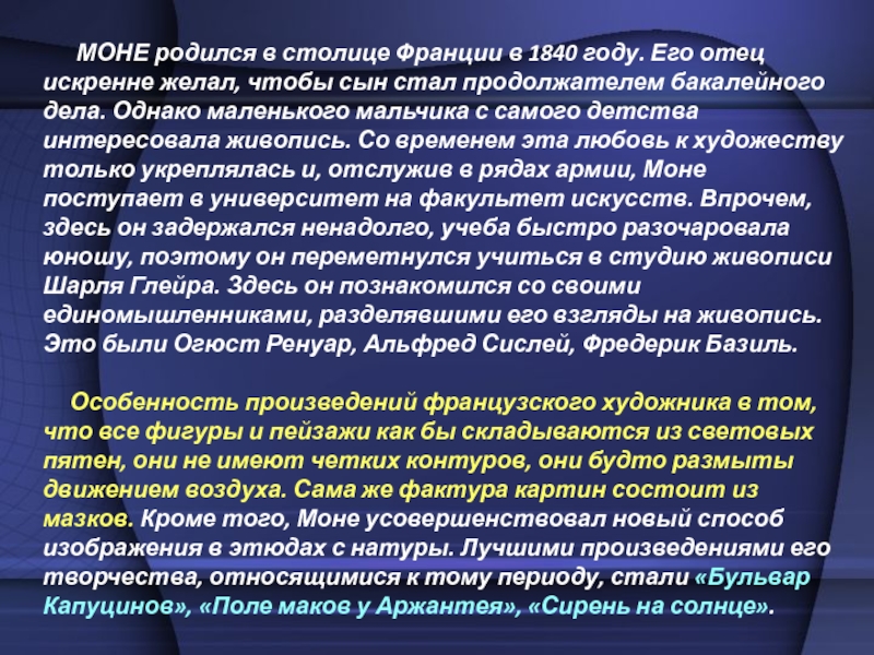 МОНЕ родился в столице Франции в 1840 году. Его отец искренне желал, чтобы сын