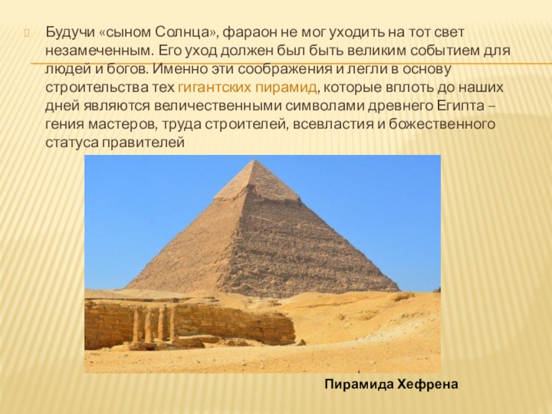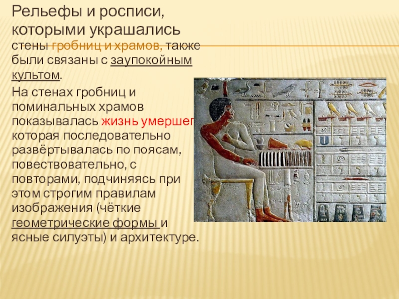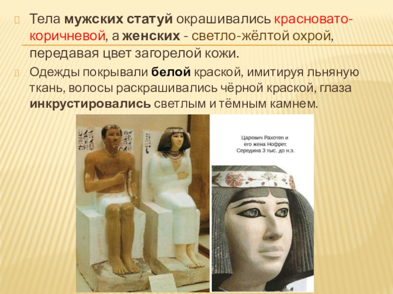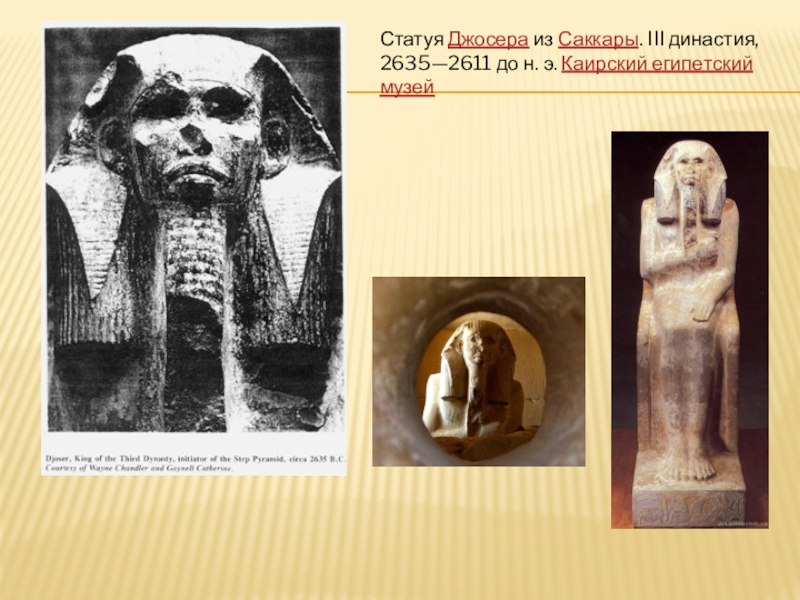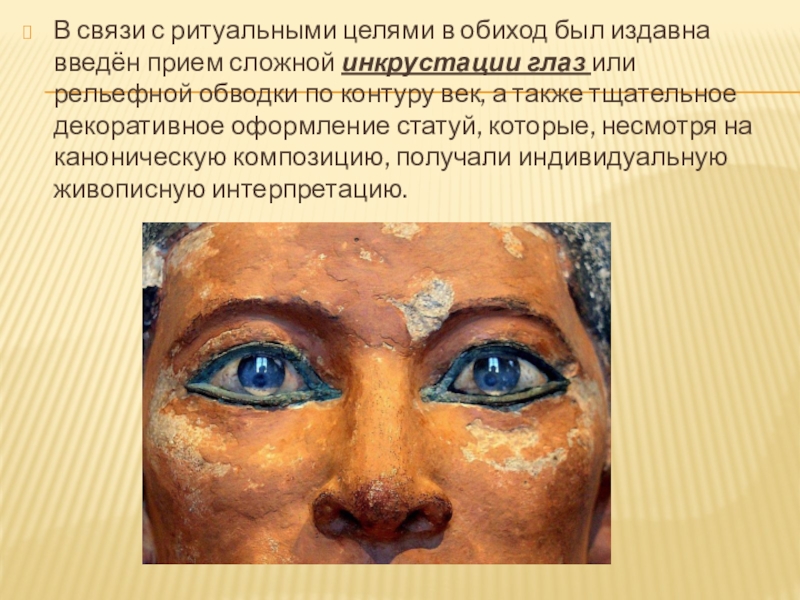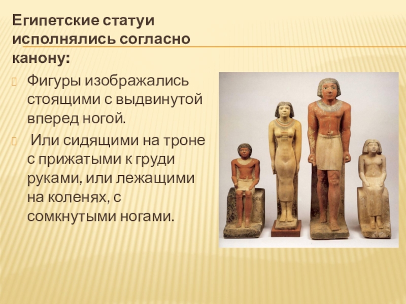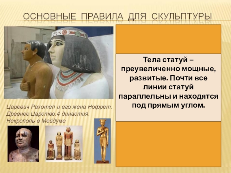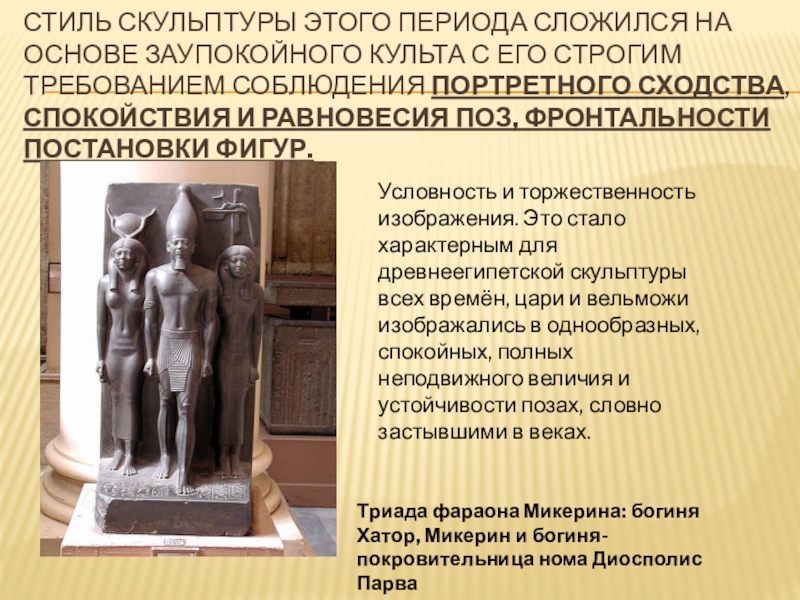 Условность и торжественность изображения. Это стало характерным для древнеегипетской скульптуры всех времён, цари и вельможи изображались в однообразных, спокойных, полных неподвижного величия и устойчивости позах, словно застывшими в веках.
