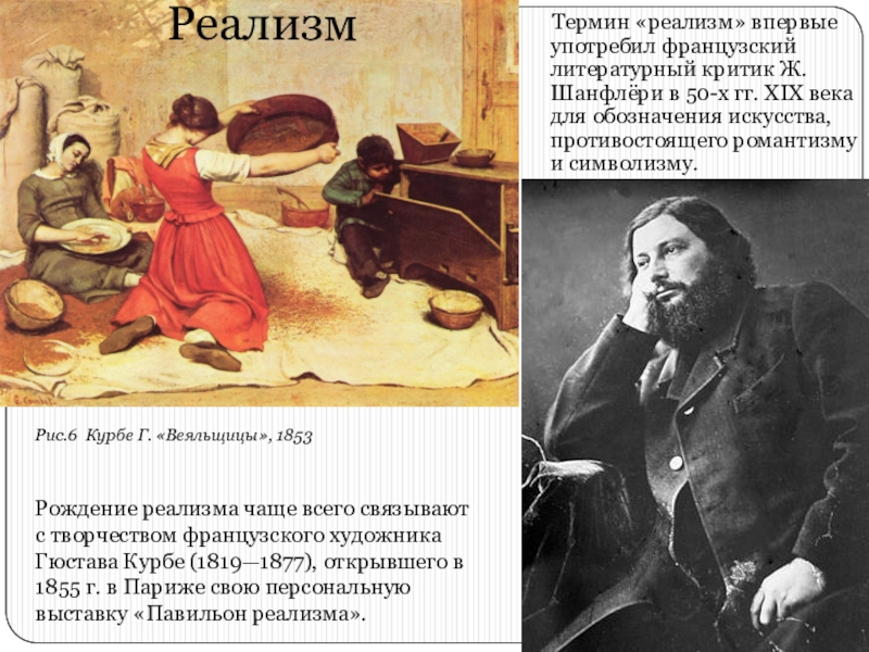 Рождение реализма чаще всего связывают с творчеством французского художника Гюстава Курбе (1819—1877), открывшего в 1855 г. в Париже свою персональную выставку «Павильон реализма».