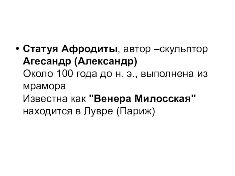 Статуя Афродиты, автор –скульптор Агесандр (Александр) Около 100 года до н. э., выполнена из мрамора Известна как