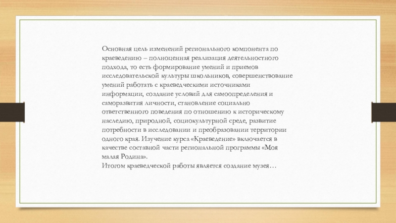 Слайд 2Основная цель изменений регионального компонента по краеведению – полноценная реализация деятельностного